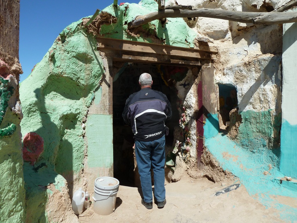 Skid looking into one of the mountain caverns. Leonard recently got a letter from a California Senator letting him know that he may be able to get Salvation Mountain in the National Registry of something